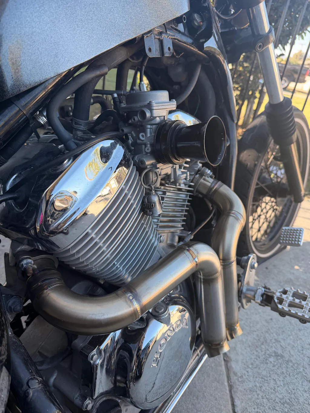 The Boot Burner exhaust for your Honda Shadow VT600 is now constructed of 304 stainless steel, for long lasting looks and durability. Do they REALLY burn your boots? If you stand on them like a dummy, sure, but when riding... no... duh! They are designed to sit close to the body of the bike inside the space where the heel of your boot lands when riding giving your boots plenty of room.